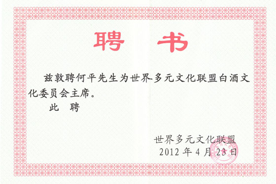聘何平先生为世界多元文化联盟白酒文化委员会主席
